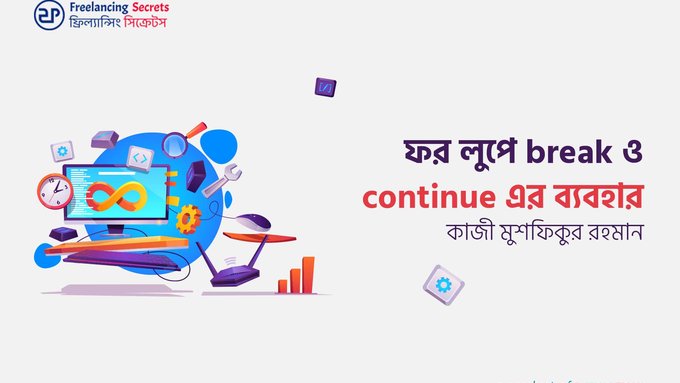 break ও continue উভয়টি ব্যবহার করে লুপের ফ্লো কন্ট্রোল করা যায়। যতক্ষণ পর্যন্ত কন্ডিশন মিথ্যা না হয় ততক্ষণ লুপ একটি নির্দিষ্ট কোড ব্লকের উপরে চলতে থাকে। কিন্তু কখনো আমাদের কারেন্ট ইটারেশন স্টপ করার প্রয়োজন হয়, এমনকি কন্ডিশন চেক করা ছাড়াই আমরা সমগ্র লুপটি বাতিল করতে চাই। এসকল ক্ষেত্রে break ও continue কাজে লাগে। (এগুলো হোয়াইল লুপের ক্ষেত্রেও ব্যবহৃত হয়, পরবর্তীতে আমি এটি নিয়ে বিস্তারিত আলোচনা করব)। এখন আমরা উদাহরণসহ এদের ব্যবহার দেখব।