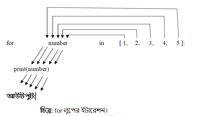 for number in [1, 2, 3, 4, 5]: , এখানে ‘[1, 2, 3, 4, 5]’ নাম্বারের একটি লিস্ট, এর অর্থ হলো: লিস্ট থেকে প্রতিবারে একটি করে নাম্বার, number নামক ভ্যারিয়েবলের মধ্যে জমা হবে। তখন এর ভ্যালু হবে ৫ টি, যথাক্রমে: number = 1, number = 2, number = 3, number = 4, এবং number = 5। এবং প্রত্যেকবারে একটি করে মোট ৫ টি নাম্বার প্রিন্ট হবে। আমরা লক্ষ্য করেছি যে, ৫ টি নাম্বার প্রিন্ট করতে লুপটি ৫ বার চলেছে (ঘুরেছে),যার প্রতিটি ঘুর্ণনকে একটি ইটারেশন (iteration) বলা হয়। সুতরাং এক্ষেত্রে ইটারেশন সংখ্যা ৫।