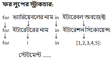 প্রথমে for কিওয়ার্ড, তারপর ভ্যারিয়েবলের (ইটারেটরের) নাম, তারপর in কিওয়ার্ড, তারপর ইটারেবল অবজেক্ট (সিকোয়েন্স), তারপর কোলন ‘ : ’। এরপর পরের লাইনে স্টেটমেন্ট উল্লেখ করতে হবে। ইটারেটরটি প্রত্যেক ইটারেশনে সিকোয়েন্সের আইটেমের ভ্যালু গ্রহণ করে। সিকোয়েন্সের শেষ আইটেম পর্যন্ত লুপ চলতে থাকে, এবং এর বডি ইন্ডেন্টেশন দিয়ে শুরু হয়। এই লুপটি for দিয়ে শুরু হয় বলে একে for loop বলে।