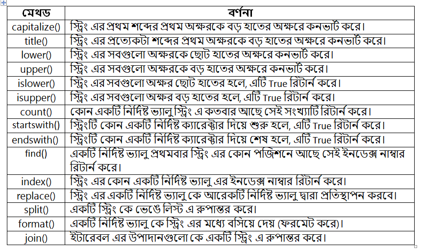বিশেষ দ্রষ্টব্য: স্ট্রিং এর বিল্ট ইন মেথড নিয়ে আমি কয়েকটি পর্বে আলোচনা করব, পরবর্তী পর্বে আরো কিছু মেথড এর আলোচনা থাকবে।