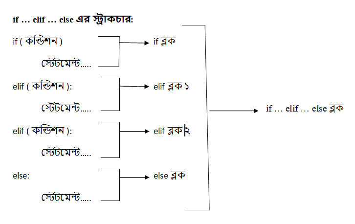 elif ব্লক: প্রথমে ‘elif’, তারপর ফার্স্ট ব্রাকেটের মধ্যে কন্ডিশন, তারপরে কোলন ‘ : ’ দিতে হবে। এরপর (নিচের লাইনে) এর অধীনে স্টেটমেন্ট উল্লেখ করতে হবে।