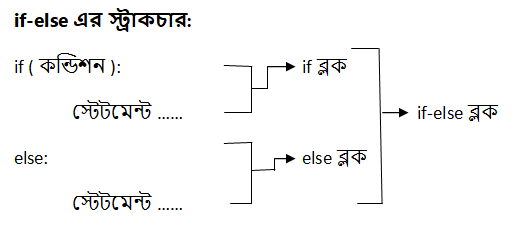 else ব্লক: প্রথমে ‘else’, তারপরে কোলন ‘ : ’ দিতে হবে। এরপর (নিচের লাইনে) এর অধীনে স্টেটমেন্ট উল্লেখ করতে হবে।
