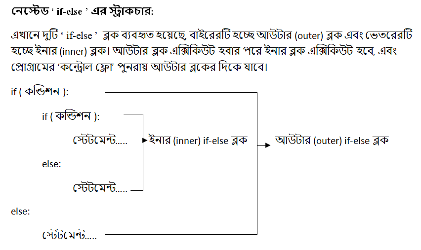 পাইথনে একটি ‘ if-else ’ ব্লকের মধ্যে আরেকটি ‘ if-else ’ ব্লক ব্যবহৃত হতে পারে, যা নেস্টেড ‘ if-else ’ নামে পরিচিত। এভাবে অসংখ্য নেস্টেড if ব্লক তৈরী করা যায়, আর এ কাজটি করা হয় ইন্ডেন্টেশনের মাধ্যমে। যেসকল ক্ষেত্রে একটি কন্ডিশনের মধ্যে আরেকটি কন্ডিশন চেক করার প্রয়োজন হয়, সেক্ষেত্রে ‘নেস্টেড if স্ট্রাকচার’ খুবই সুবিধাজনক। আমাদের রিয়েল লাইফে এধরণের সিনারিও আসে, যেখানে আমরা ডিসিশন মেকিং স্টেটমেন্ট (Decision making statement) হিসাবে এর প্রয়োগ করে থাকি।