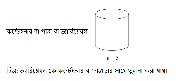 পাইথনে ভ্যারিয়েবল কে কন্টেইনার বা পাত্র এর সাথে তুলনা করা যায়। পাত্র এর মধ্যে যেমনি মালামাল স্টোর করে রাখা যায়, তেমনি ভ্যারিয়েবল এর মধ্যে ভ্যালু স্টোর করে রাখা যায়। নিচে চিত্রের সাহায্যে ভ্যারিয়েবল দেখানো হলো, যেখানে a একটি ভ্যারিয়েবল, যার মধ্যে ভ্যালু 5 এসাইন করা হয়েছে (স্টোর করে রাখা হয়েছে)। পাত্র রাখতে যেভাবে একটি জায়গা এর প্রয়োজন হয়, একইভাবে এই ভ্যারিয়েবলটি এর জন্য ও মেমরিতে একটি জায়গা এর দরকার হবে, যে প্রক্রিয়া এর মাধ্যমে এই কাজটি সম্পন্ন হয় তাকে মেমরি অ্যালোকেশন বলা হয়।