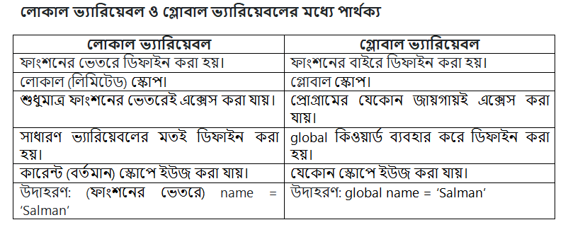 ভ্যারিয়েবল যখন ফাংশনের ভেতরে ডিফাইন করা হয় তখন তাকে লোকাল ভ্যারিয়েবল বলে। এবং এর স্কোপ (ব্যবহারের পরিধি) নির্দিষ্ট ফাংশনের মধ্যে সীমাবদ্ধ। অর্থাৎ তাকে কেবলমাত্র ফাংশনের ভেতরেই এক্সেস (ব্যবহার) করা যায়, ফাংশনের বাইরে ব্যবহার করা যায় না। আর ভ্যারিয়েবল যখন ফাংশনের বাইরে ডিফাইন করা হয় তখন তাকে গ্লোবাল ভ্যারিয়েবল বলে, এবং তাকে প্রোগ্রামের যেকোন জায়গায় ব্যবহার করা যায়।