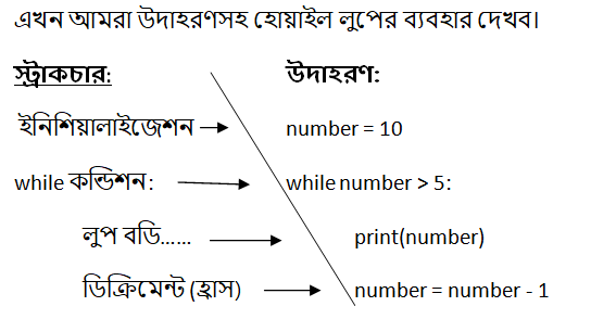 প্রথমে ‘while’ কিওয়ার্ড, তারপরে কন্ডিশন (টেস্ট এক্সপ্রেশন), তারপরে কোলন। এর পরের লাইনে লুপের বডি ইন্ডেন্টেশন দিয়ে শুরু হবে।