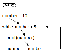 কন্ডিশন চেক: যেহেতু নাম্বারটি (5), 5 থেকে বড় নয়, (কন্ডিশনটি মিথ্যা), তাই 5 প্রিন্ট হবে না। বরং লুপটি শেষ হয়ে যাবে।
