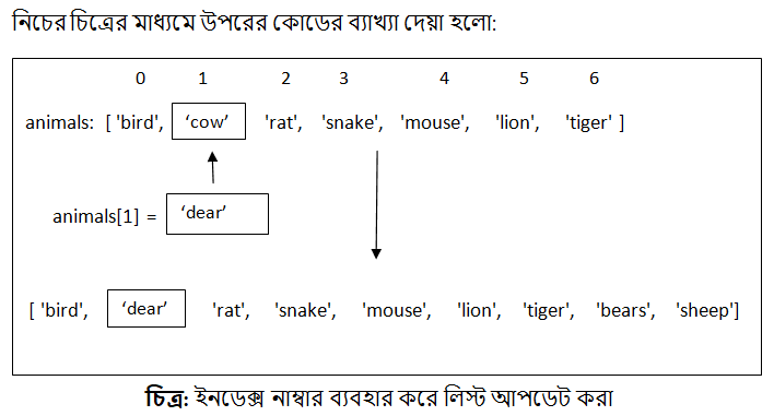 প্রথমে লিস্টের নাম, তারপর থার্ড ব্রাকেটের মধ্যে নির্দিষ্ট ইনডেক্স নাম্বার, তারপর ‘=’ চিহ্ন, তারপর নতুন ভ্যালু দিতে হবে।