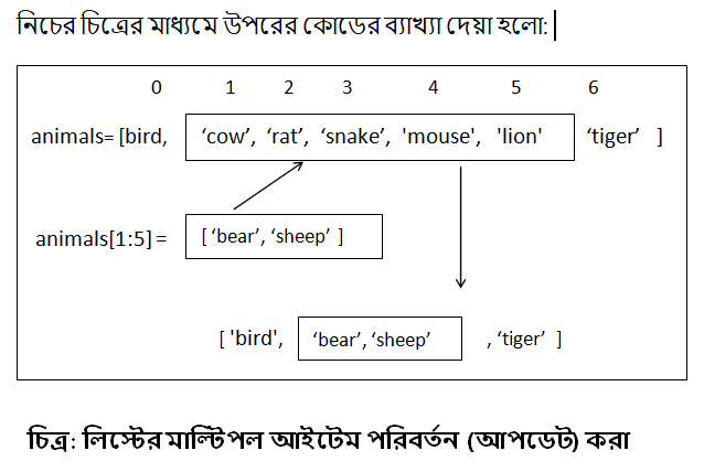 প্রথমে লিস্টের নাম, তারপর থার্ড ব্রাকেটের মধ্যে ইনডেক্স নাম্বার, তারপর ‘=’ চিহ্ন, তারপর থার্ড ব্রাকেটের মধ্যে একাধিক নতুন আইটেম দিতে হবে।
