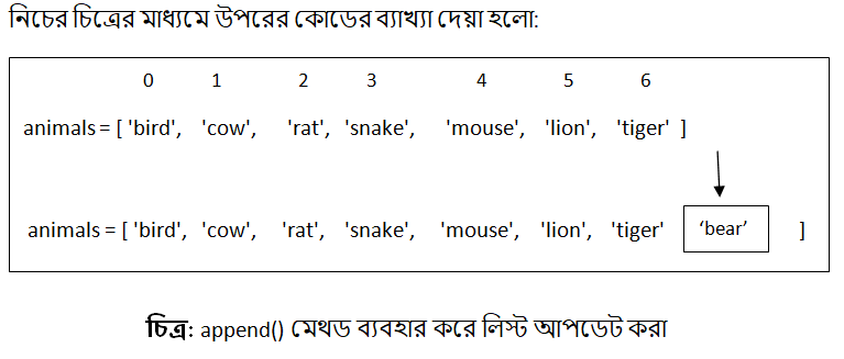 উপরের কোডের প্রথম লাইনে আমি ৭ টি প্রাণীর একটি লিস্ট [ 'bird', 'cow', 'rat', 'snake', 'mouse', 'lion', 'tiger' ] তৈরী করেছি। দ্বিতীয় লাইনে একটি স্ট্রিং প্রিন্ট করেছি। তৃতীয় লাইনে append() মেথড ব্যবহার করে বিদ্যমান লিস্টের শেষে নতুন একটি ভ্যালু 'bear' যোগ করেছি। চতুর্থ লাইনে আপডেট লিস্টটি প্রিন্ট করেছি। এখন কোডটি রান করলে নিচের মত আউটপুট পাব।